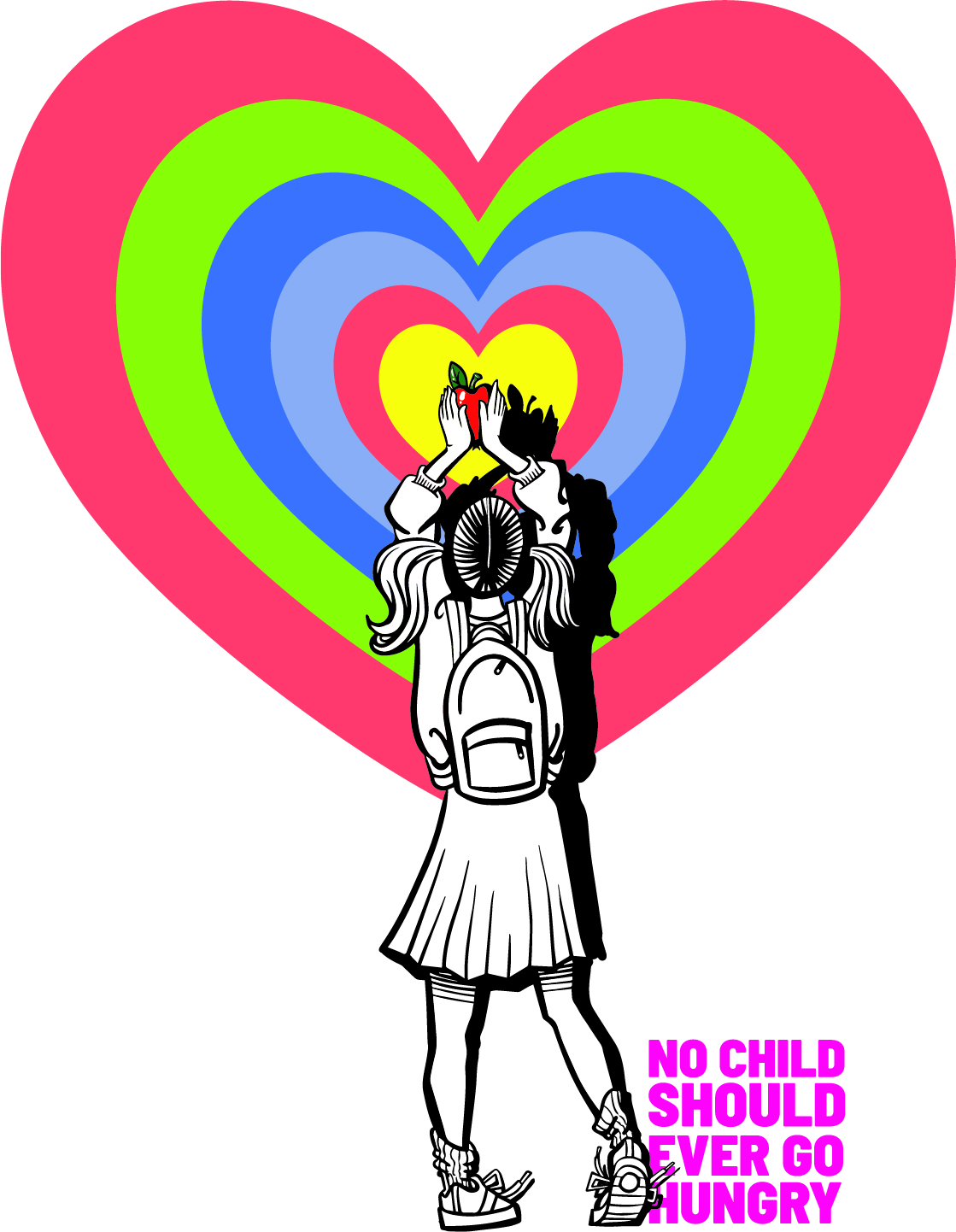 This mural depicts a child holding aloft an apple as heart shaped color bands radiate outward. Feeding hungry children is an act of community, and an act of love. The mural focuses on the both the act of giving food and the child as recipient.